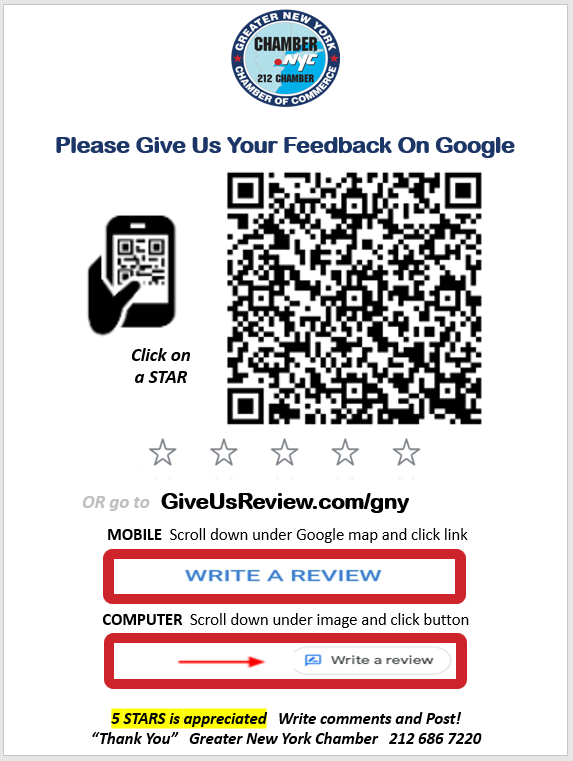 SCAN or point your camera at the funny looking box. No QR scanner, no problem! Type the short address above into your MOBILE browser and then try it from your COMPUTER. Once you are taken to the starting point (where you need to be to write a review) you will see the same POP UP window to click on a star, write your comments and POST!
